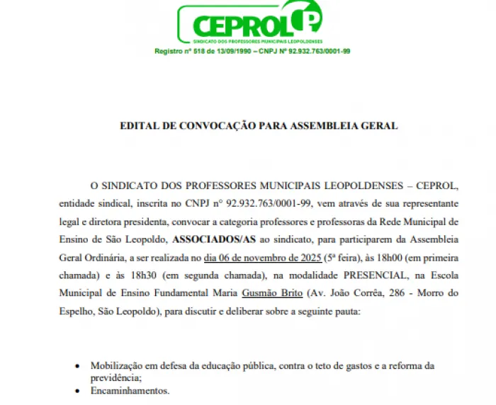 O CEPROL Sindicato convoca a categoria professores e professoras da Rede Municipal de Ensino de São Leopoldo, ASSOCIADOS/AS ao sindicato, para participarem da Assembleia Geral Ordinária.